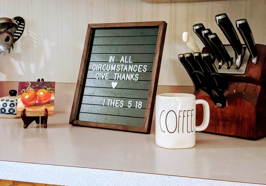 I recently got a letterboard and immediately plastered that annoying verse from 1 Thessalonians on it: “In all circumstances, give thanks.” (1 Thes. 5: 18).
